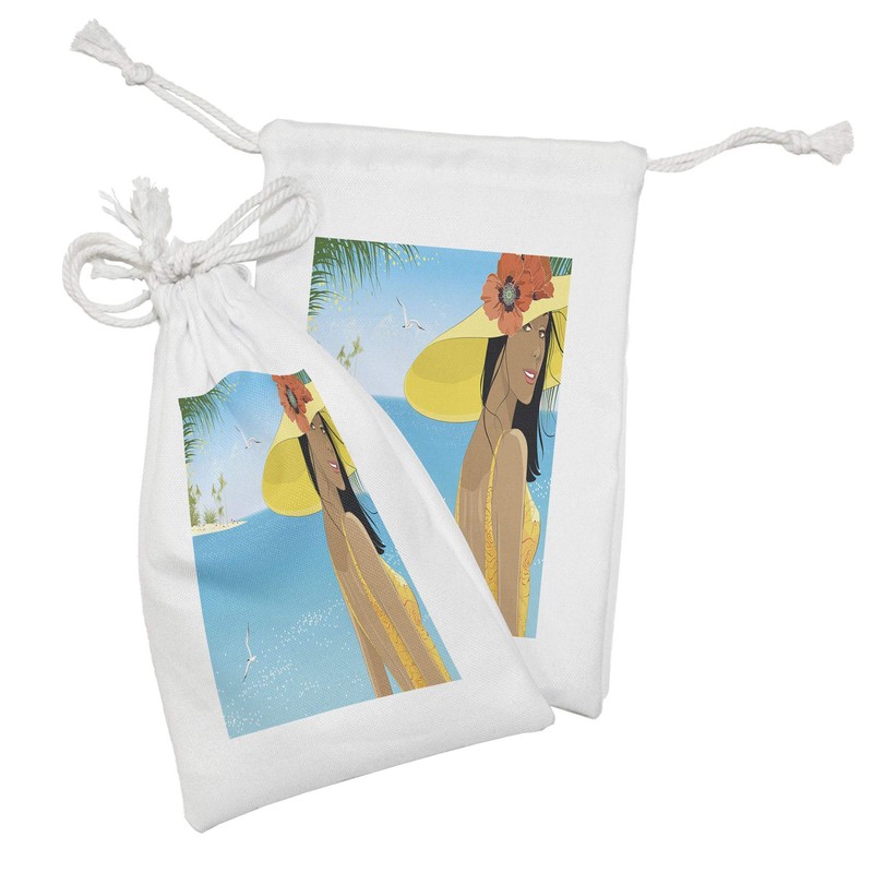 Ambesonne Beach Fabric Pouch Set of 2, Portrait of a Young Woman in Yellow Hat with Poppies on Tropical Sea Coast in Summer, Small Drawstring Bag for Toiletries Masks and Favors, 9" x 6", Multicolor