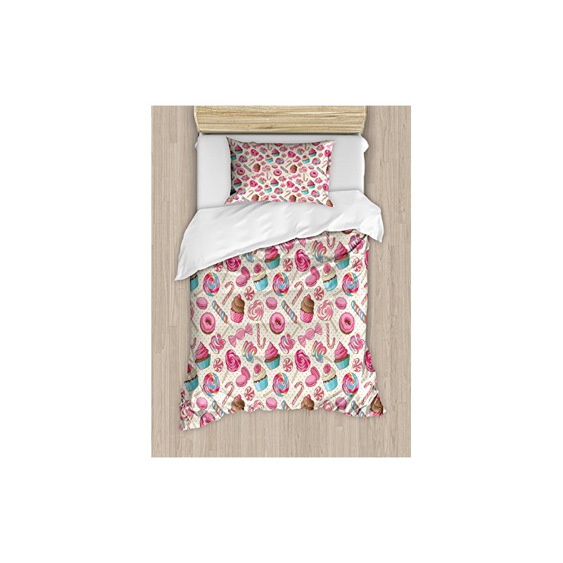 Ambesonne Candy Cane Duvet Cover Set, Yummy Lollipop Candy Macaroon Cupcake a...