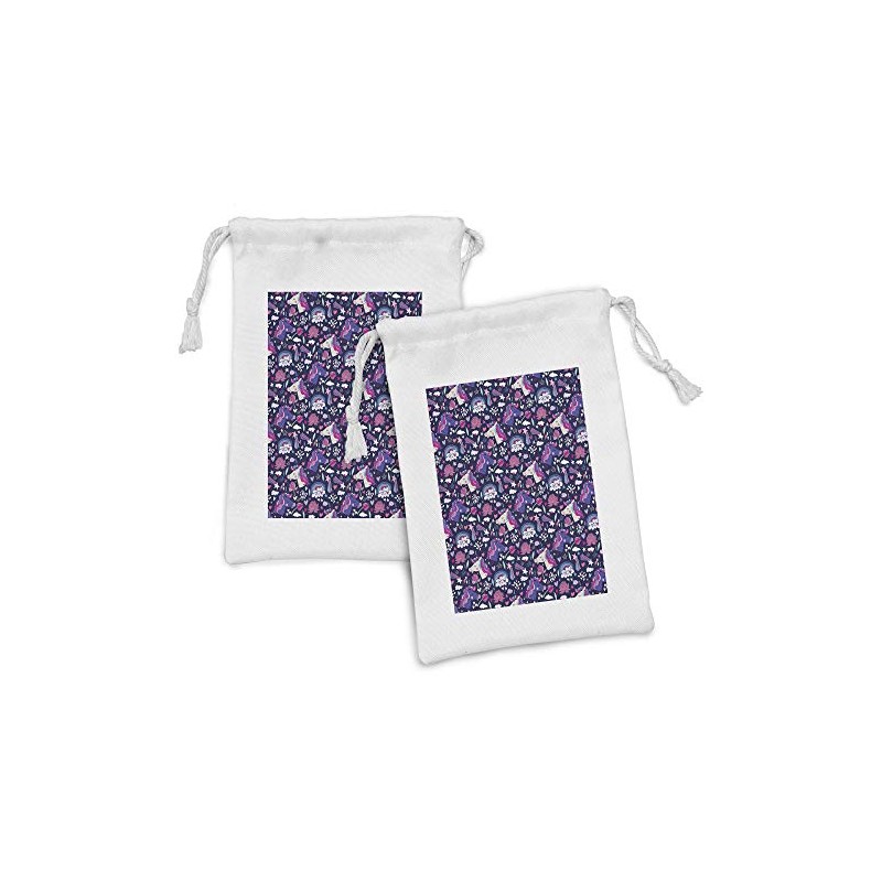 Ambesonne Cartoon Fabric Pouch Set of 2, Unicorns Shooting Stars Clouds Imagination Hearts Love Funny, Small Drawstring Bag for Toiletries Masks and Favors, 9" x 6", Pink Blue Violet Indigo