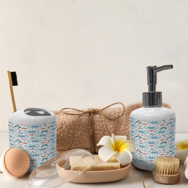 Ambesonne Cartoon Soap Dispenser & Toothbrush Holder Set, Smiling Sun Mushrooms Hearts Flowers Shower Elements, Ceramic Bathroom Toiletry Accessories, 2 Pcs, Pale Azure Blue Coral