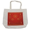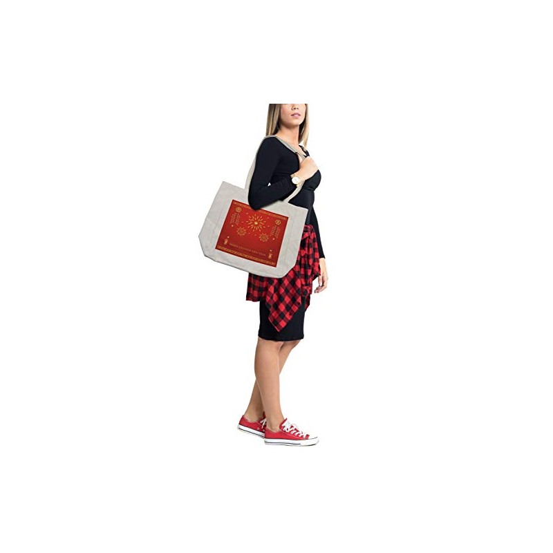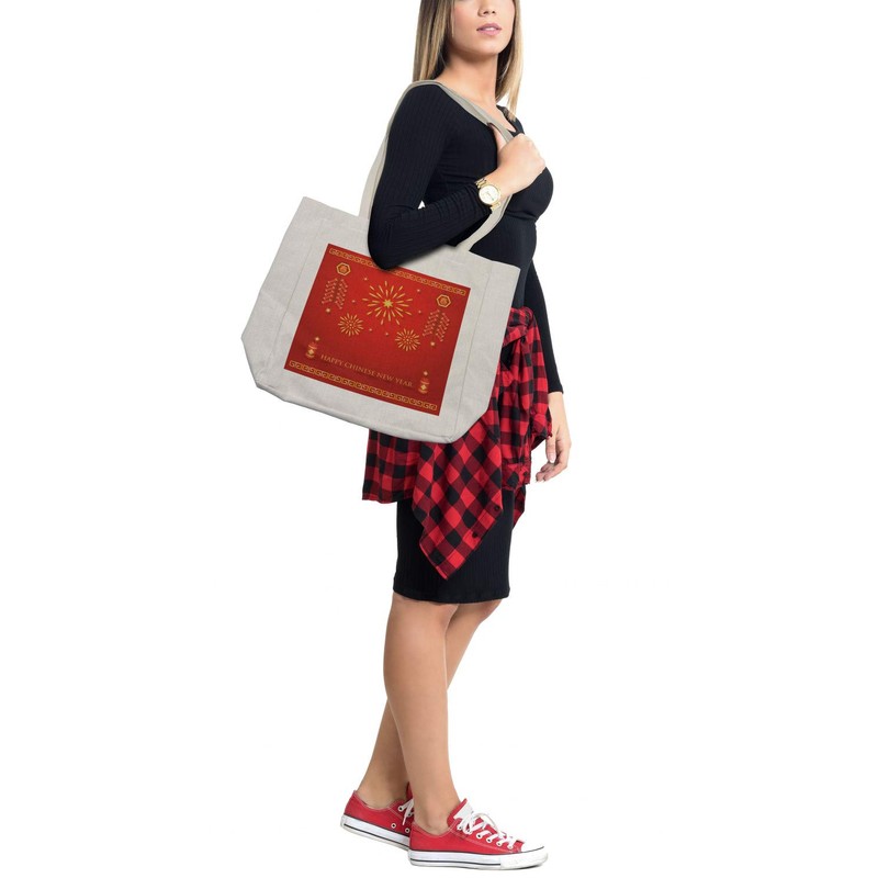 Ambesonne Chinese New Year Shopping Bag, Celebration with Fireworks and Firecrackers Oriental Culture, Eco-Friendly Reusable Bag for Groceries Beach and More, 15.5" X 14.5", Cream