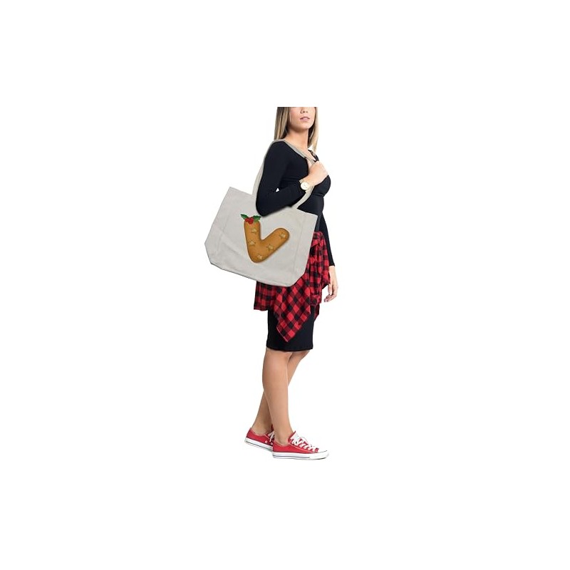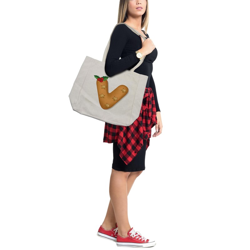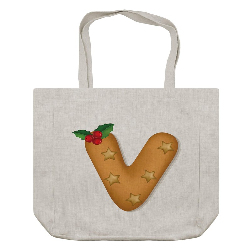 Ambesonne Christmas Alphabet Shopping Bag, Xmas Cookie Like Letter V with Stars and Mistletoe Berries, Eco-Friendly Reusable Bag for Groceries Beach and More, 15.5" X 14.5", Cream