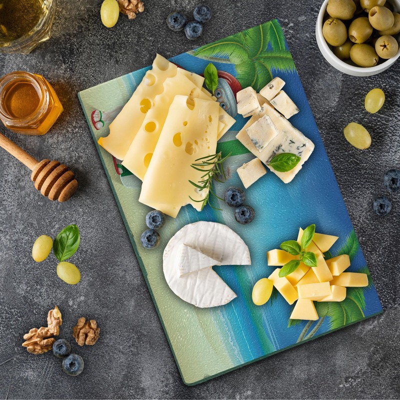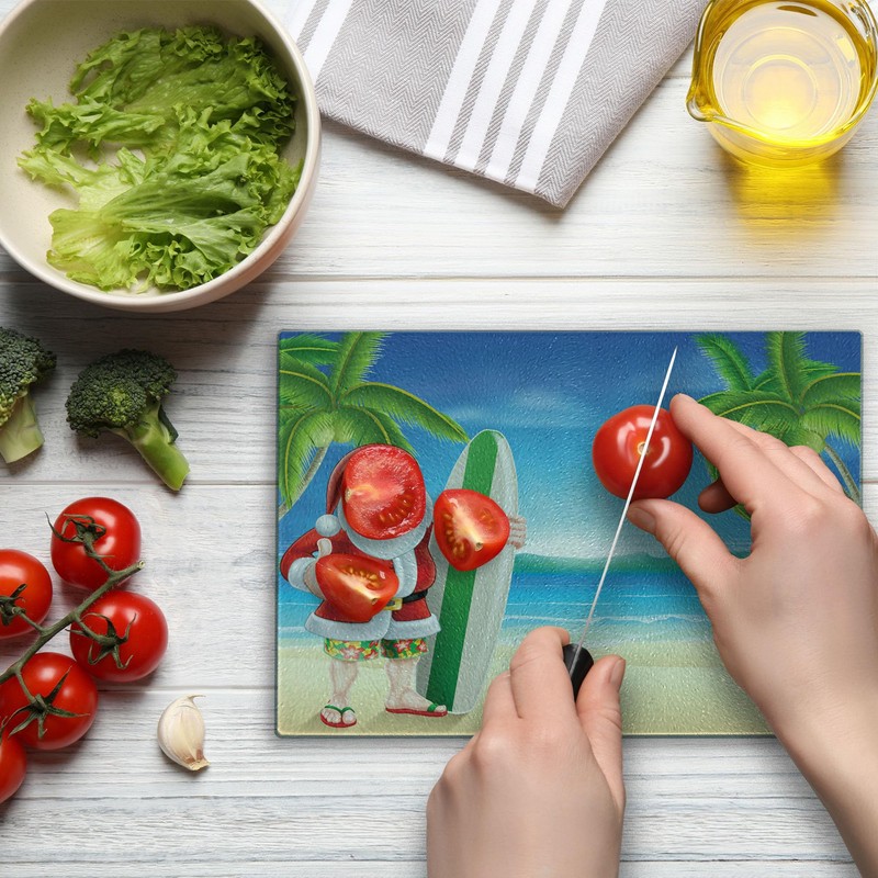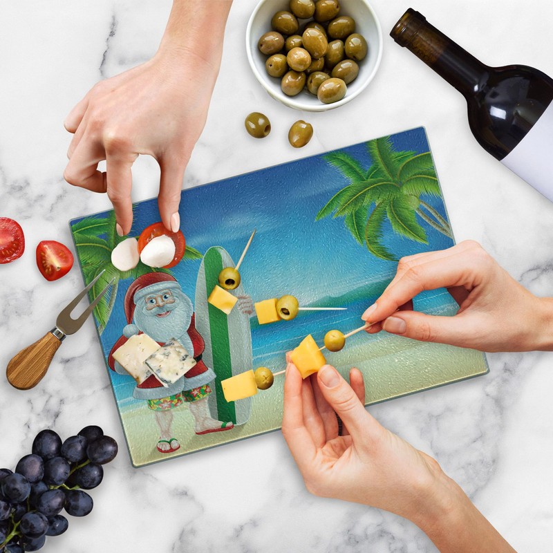 Ambesonne Christmas Cutting Board, Santa Claus with Trunks on the Beach and Surfboard Sunny Hot Christmas Theme, Decorative Tempered Glass Cutting and Serving Board, Small Size, Blue Green