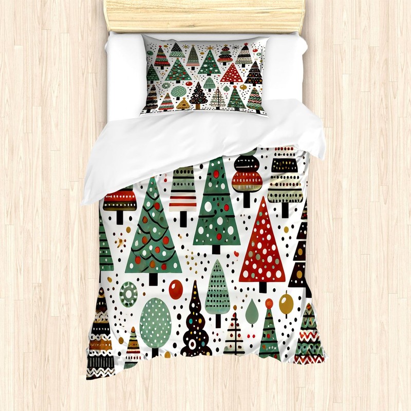 Ambesonne Christmas Duvet Cover Set, Simple Starry Woodland Pine Trees Pattern with Dots and Triangles, Decorative 2 Piece Bedding Set with 1 Pillow Sham, Twin Size, Jade Green White Paprika