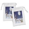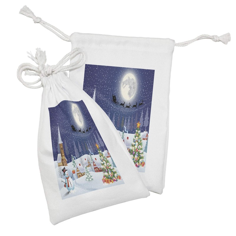 Ambesonne Christmas Fabric Pouch Set of 2, Winter Season Snowman Xmas Tree Santa Sleigh Moon Present Boxes Snow and Stars, Small Drawstring Bag for Toiletries Masks and Favors, 9" x 6", White Blue