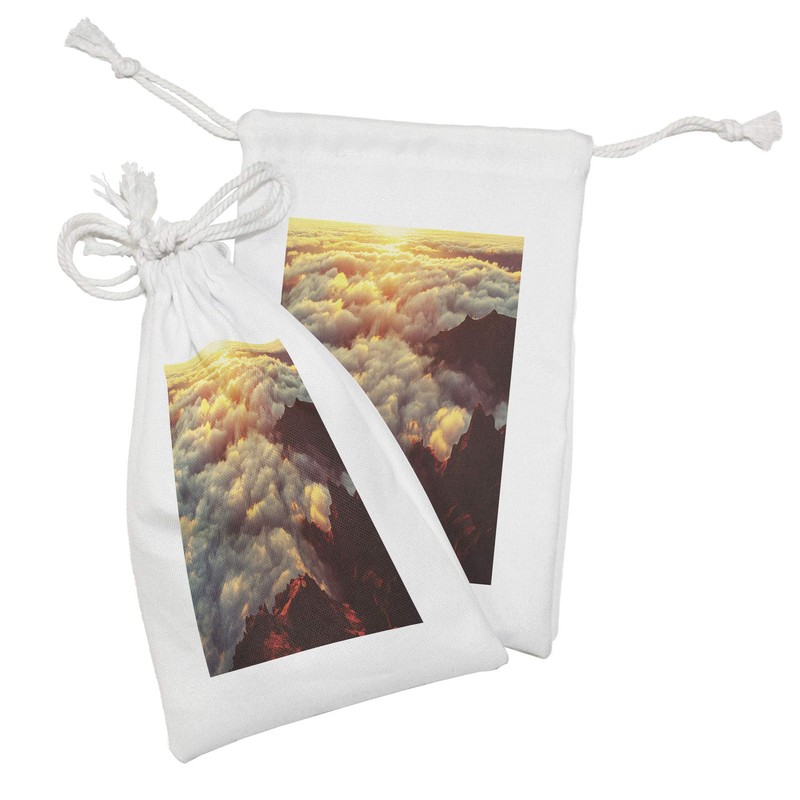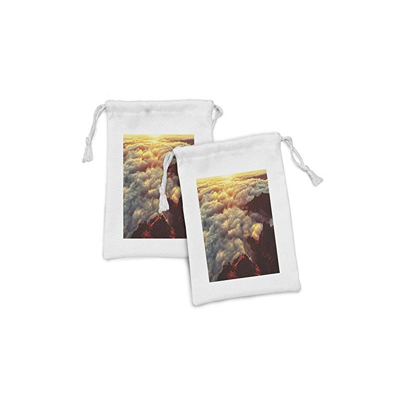 Ambesonne Clouds Fabric Pouch Set of 2, Sunset on the Hill Tops Above the Clouds Unusual Extreme Bell Flowers Print, Small Drawstring Bag for Toiletries Masks and Favors, 9" x 6", Orange White Brown