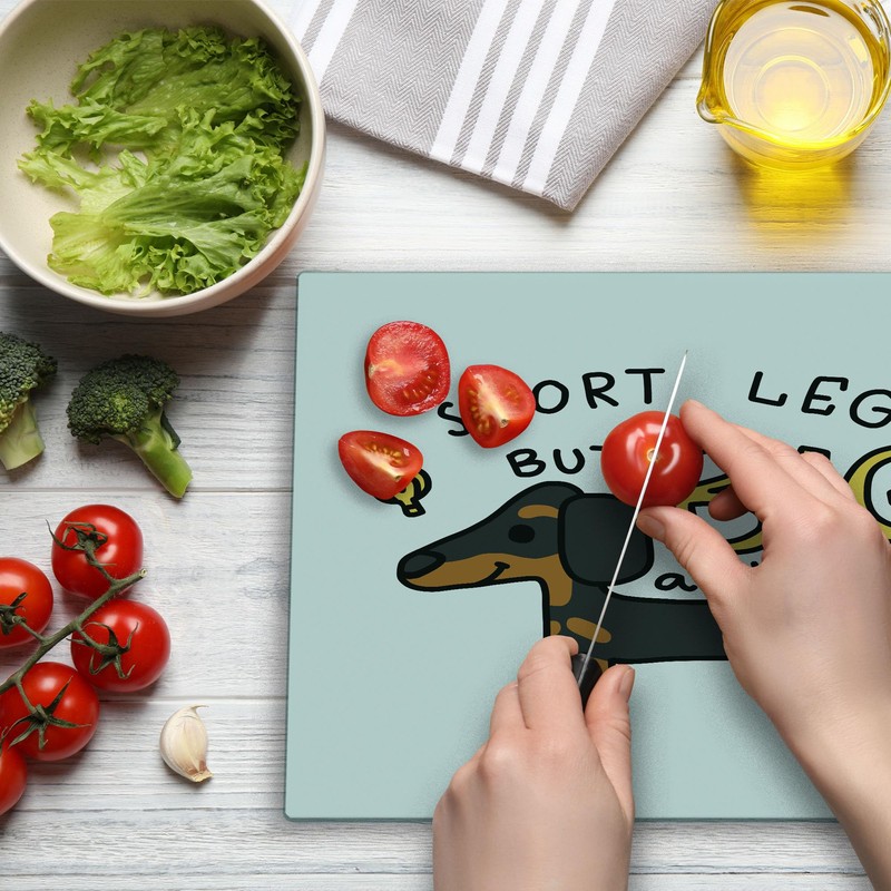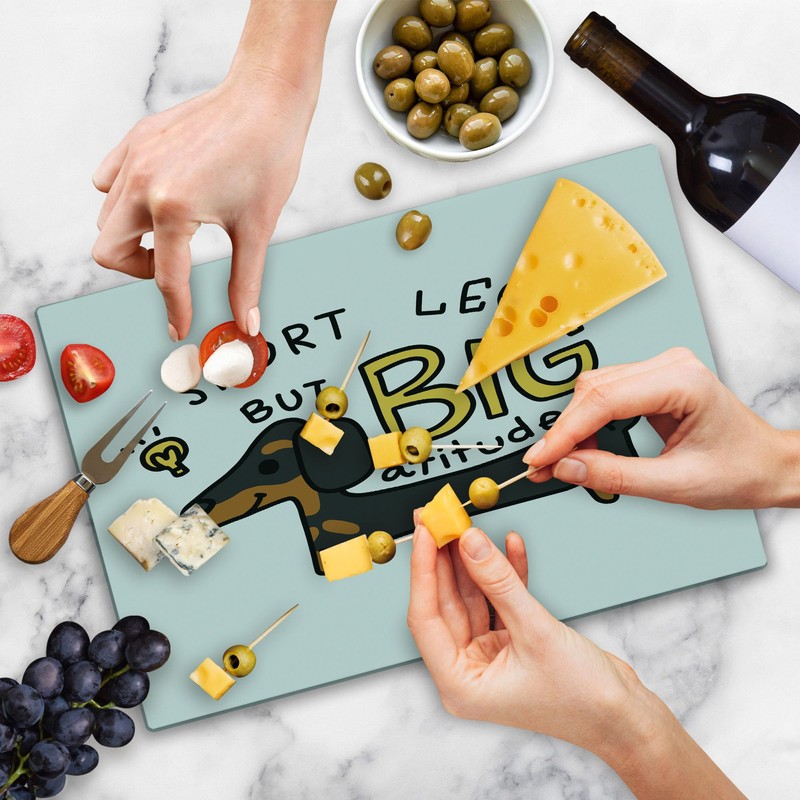 Ambesonne Dachshund Cutting Board, Short Legs but Big Attitude Text Dachshund Puppy, Decorative Tempered Glass Cutting and Serving Board, Large Size, Grey Brown