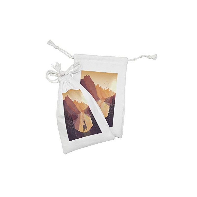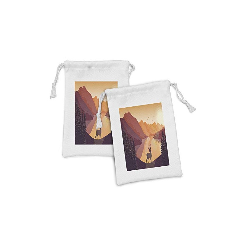Ambesonne Deer Hunting Fabric Pouch Set of 2, Reindeer Lake Mountains Birds Dusk Reflections Print, Small Drawstring Bag for Toiletries Masks and Favors, 9" x 6", Apricot Dried Rose