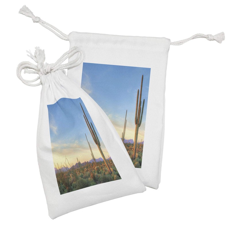 Ambesonne Desert Fabric Pouch Set of 2, Sonoran Desert Catching Days Last Rays Saguaro Cactus Wild Vegetation, Small Drawstring Bag for Toiletries Masks and Favors, 9" x 6", Green Orange Pale Blue