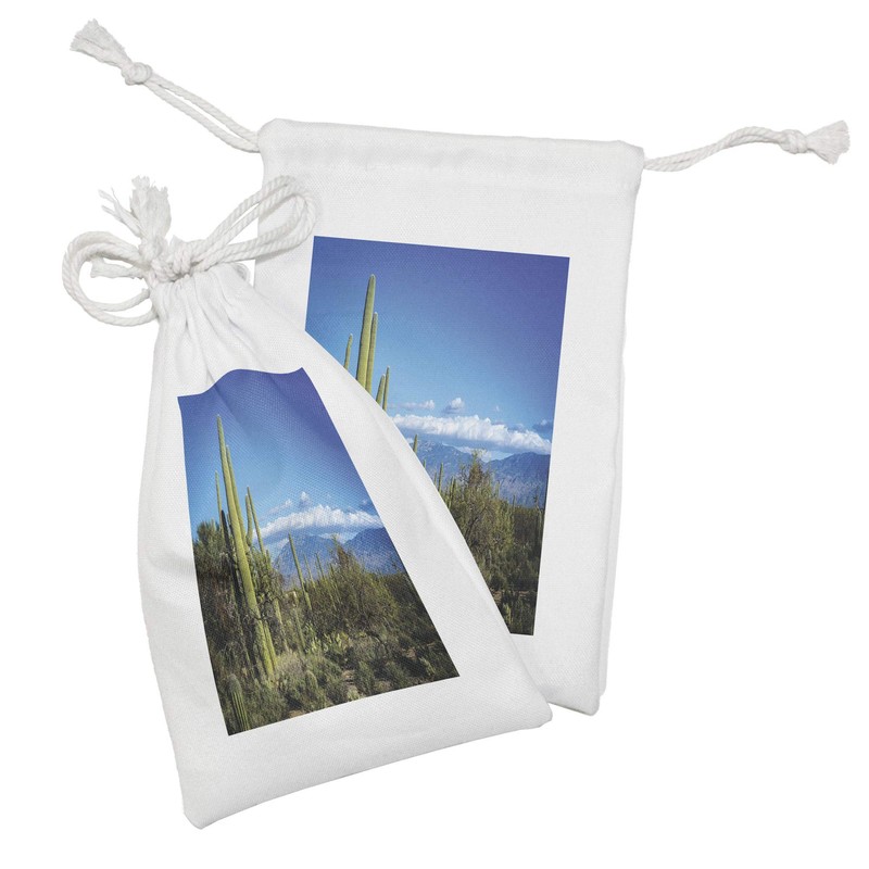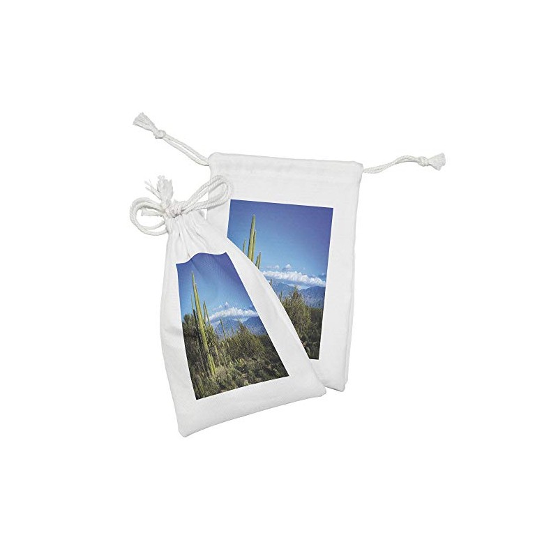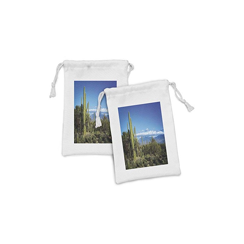 Ambesonne Desert Fabric Pouch Set of 2, Wide View of the Tucson Countryside with Cacti Rural Wild Landscape Arizona Phoenix, Small Drawstring Bag for Toiletries Masks and Favors, 9" x 6", Green Blue