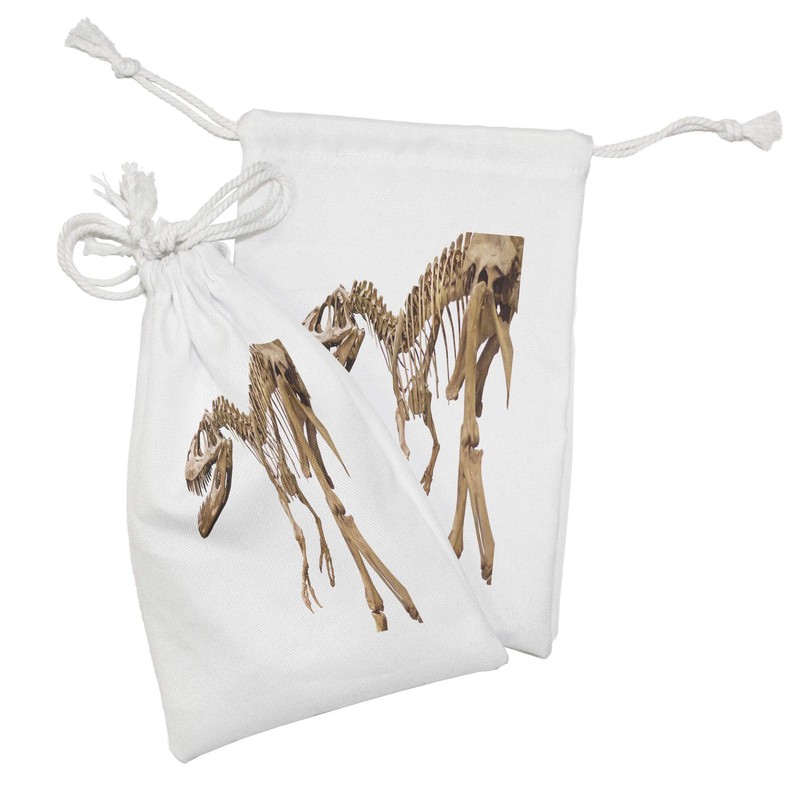 Ambesonne Dinosaur Fabric Pouch Set of 2, Archeology Museum Theme Wild Tyrannosaurus Rex Skeleton Jurassic Period, Small Drawstring Bag for Toiletries Masks and Favors, 9" x 6", Pale Caramel White