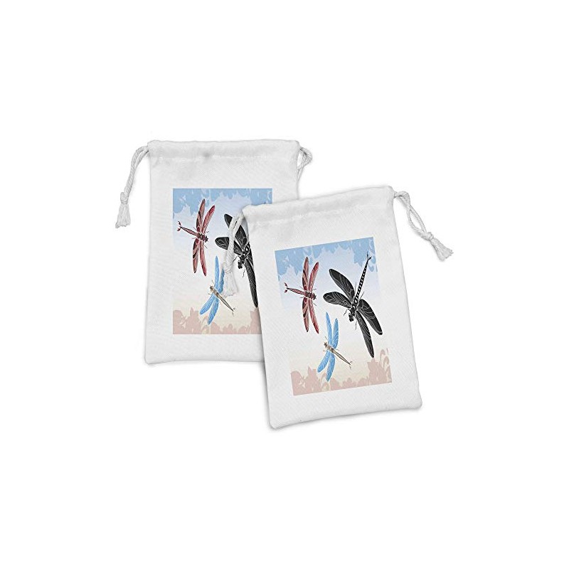 Ambesonne Dragonfly Fabric Pouch Set of 2, Exotic Dragonflies Flying in Cloud Sky Animal Wing Nature Illustration, Small Drawstring Bag for Toiletries Masks and Favors, 9" x 6", Black Blue Pale Pink