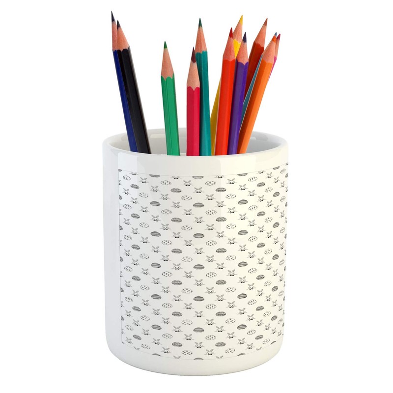 Ambesonne Easter Pencil Pen Holder, Black and White Pattern Hand Drawn Style Rabbits with Bowties and Patterned Eggs, Printed Ceramic Pencil Pen Holder for Desk Office Accessory, Black White