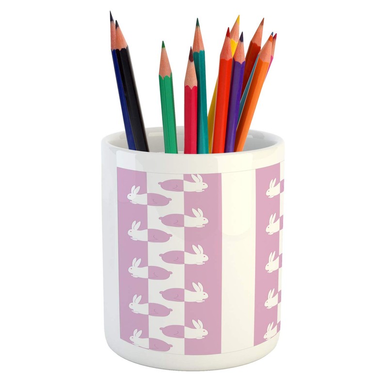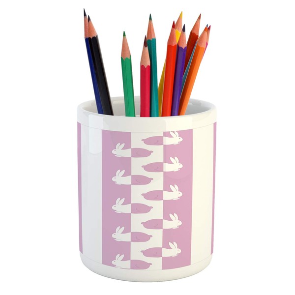 Ambesonne Easter Pencil Pen Holder, Bunny Rabbits in Vivid Pastel Tones Animal Girls Design, Ceramic Pencil Holder for Desk Office Accessory, 3.6" X 3.2", White Pink