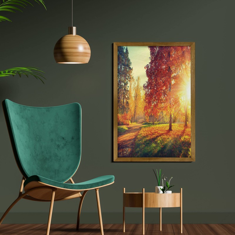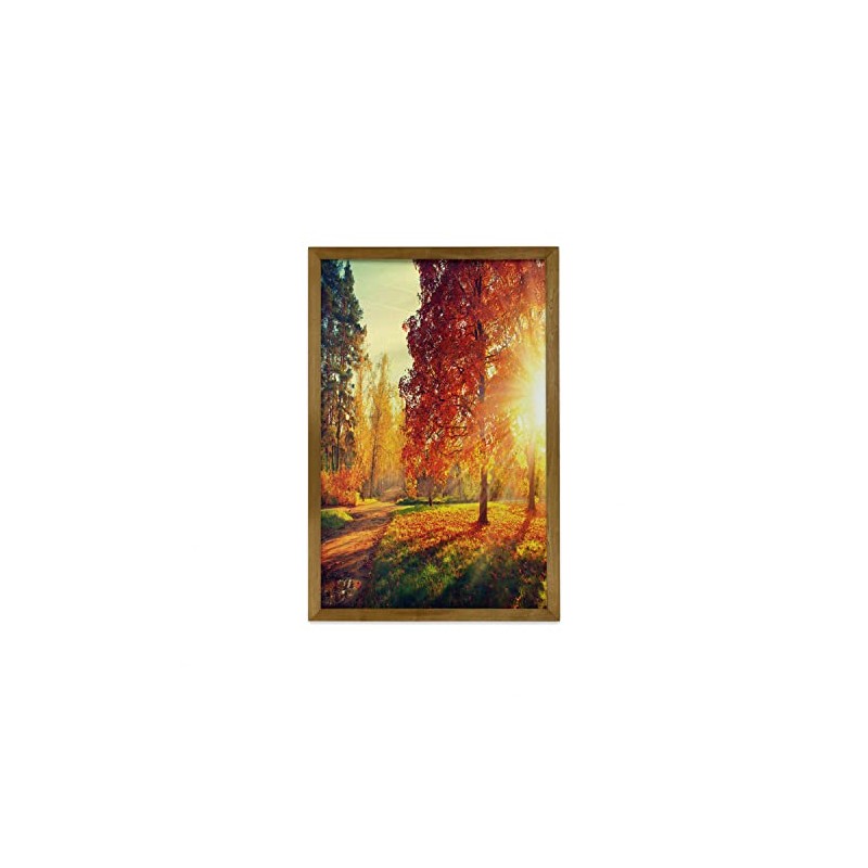 Ambesonne Fall Framed Wall Art, Vibrant Misty Day in Forest Sun Rays Trees Foliage Fallen Leaves Calm View, Fabric Poster with Walnut Tone Wood Frame Home Dorm Decor, 23" x 35", Orange Yellow Green