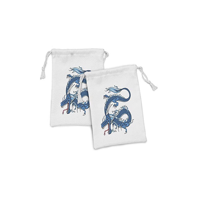 Ambesonne Fantasy Fabric Pouch Set of 2, Dragon Mythical Creature Japanese Culture Folk Print, Small Drawstring Bag for Toiletries Masks and Favors, 9" x 6", Pale Blue Dark Blue