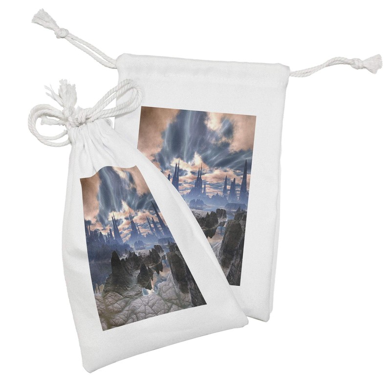 Ambesonne Fantasy Fabric Pouch Set of 2, Stormy Apocalypse Sky with Clouds over Rock Towers on Alien World, Small Drawstring Bag for Toiletries Masks and Favors, 9" x 6", Dark Brown Dark Blue