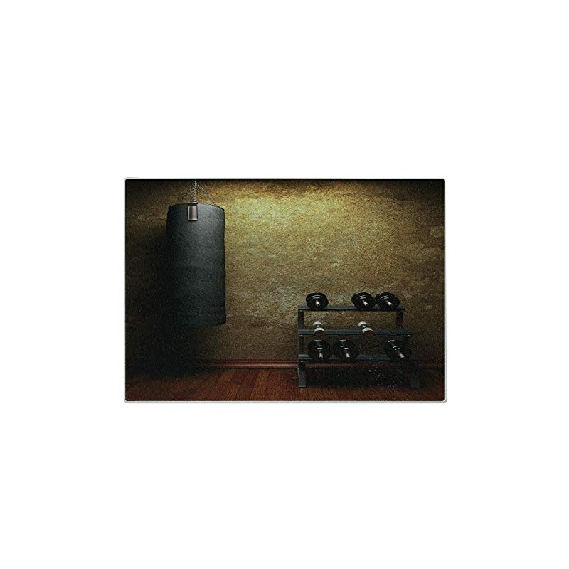 Ambesonne Fitness Cutting Board, Gym Room with Equipments Dumbbells Work Out Concept 3D Digital Print, Decorative Tempered Glass Cutting and Serving Board, Small Size, Black Redwood Pale Brown