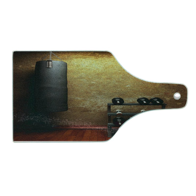 Ambesonne Fitness Cutting Board, Gym Room with Equipments Dumbbells Work Out Concept 3D Digital Print, Decorative Tempered Glass Cutting and Serving Board, Wine Bottle Shape, Black Redwood Pale Brown