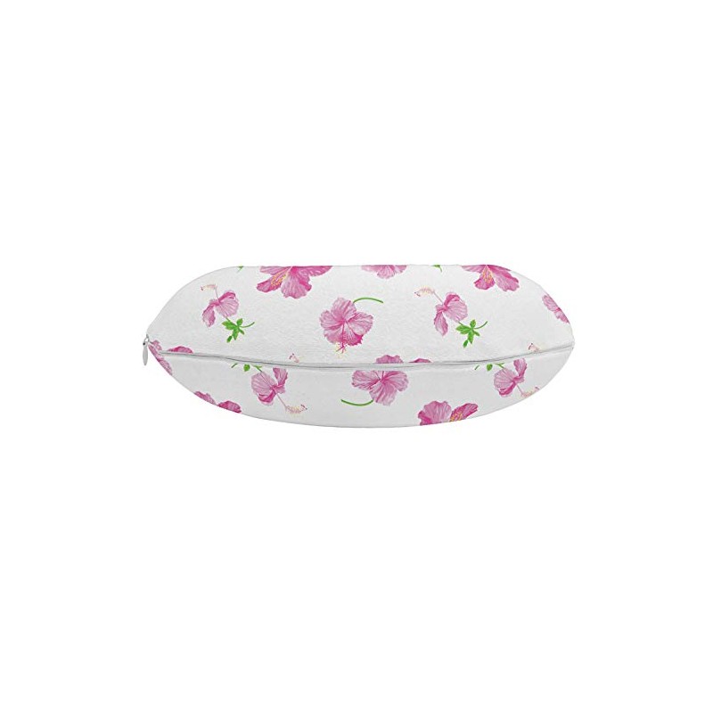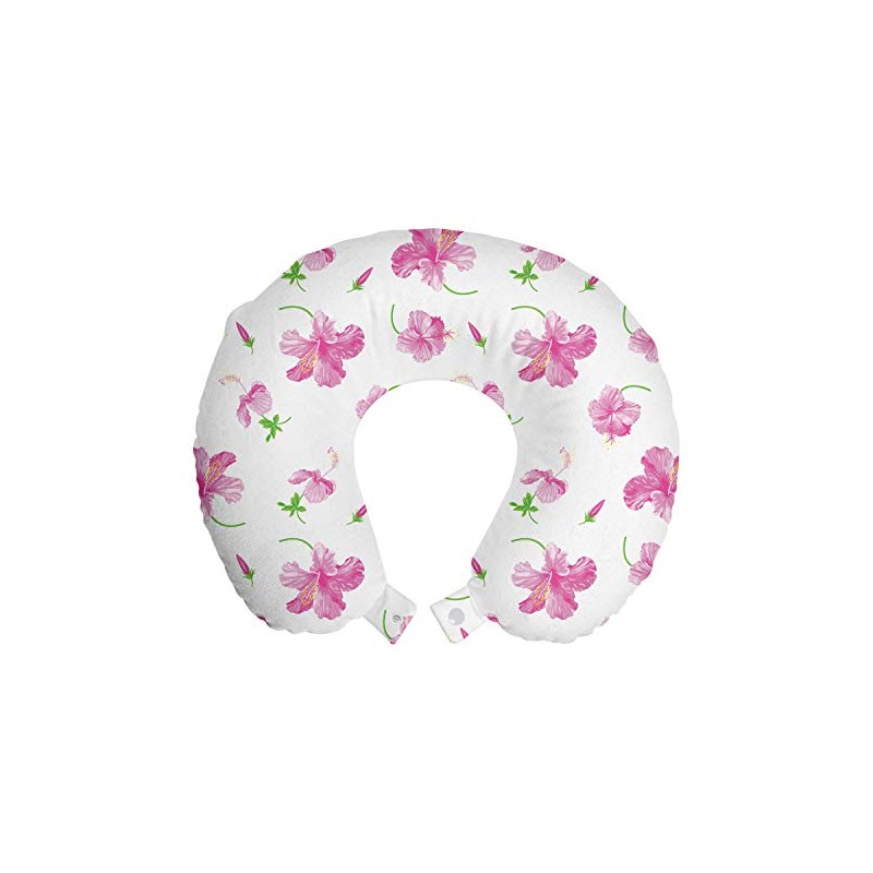 Ambesonne Flower Travel Pillow Neck Rest, Hibiscus Bloom Flowers on a Plain Background with Floral Patterns in Country Style, Memory Foam Traveling Accessory for Airplane and Car, 12", Pink White