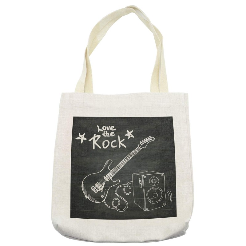 Ambesonne Guitar Tote Bag, Love the Rock Music Themed Sketch Art Sound Box and Text on Chalkboard, Cloth Linen Reusable Bag for Shopping Books Beach and More, 16.5" X 14", Charcoal Grey White