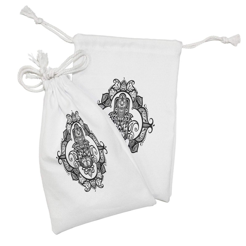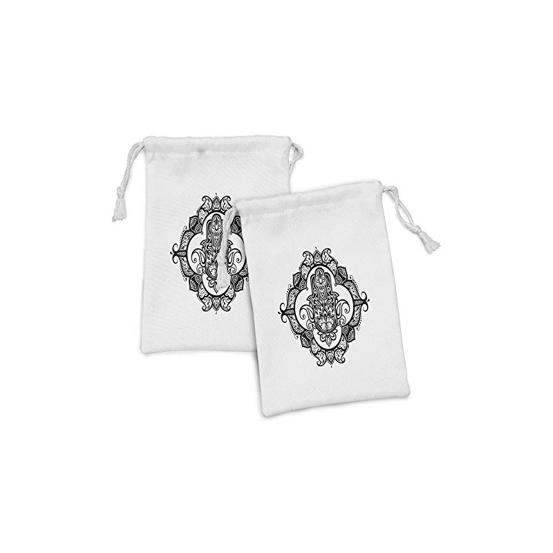 Ambesonne Hamsa Fabric Pouch Set of 2, Curvy Ornate Frame with Antique Motif Floral Tattoo, Small Drawstring Bag for Toiletries Masks and Favors, 9" x 6", White Black