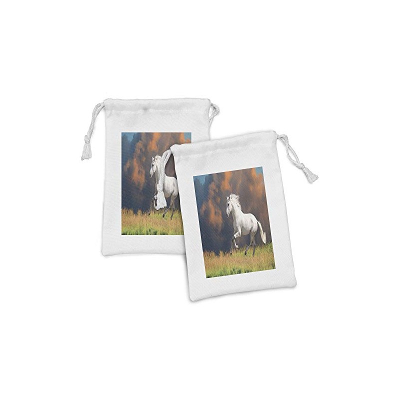 Ambesonne Horses Fabric Pouch Set of 2, Andalusian Horse with a Majestic Dust Cloud Background Strong Desires Photo, Small Drawstring Bag for Toiletries Masks and Favors, 9" x 6", White Orange Green