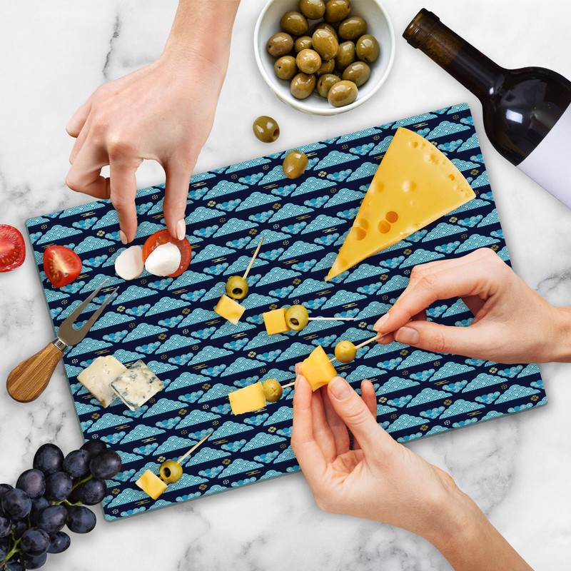 Ambesonne Japanese Cutting Board, Abstract Clouds Ornament Essential Shapes Pattern, Decorative Tempered Glass Cutting and Serving Board, Large Size, Indigo Deep Sky Blue