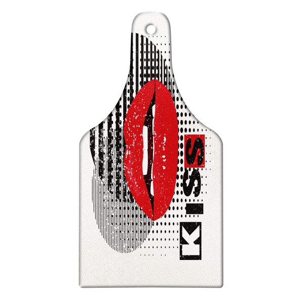 Ambesonne Kiss Me Cutting Board, Valentine's Day Typography Grunge Background Halftone and Stripes, Decorative Tempered Glass Cutting and Serving Board, Wine Bottle Shape, Vermilion Off White