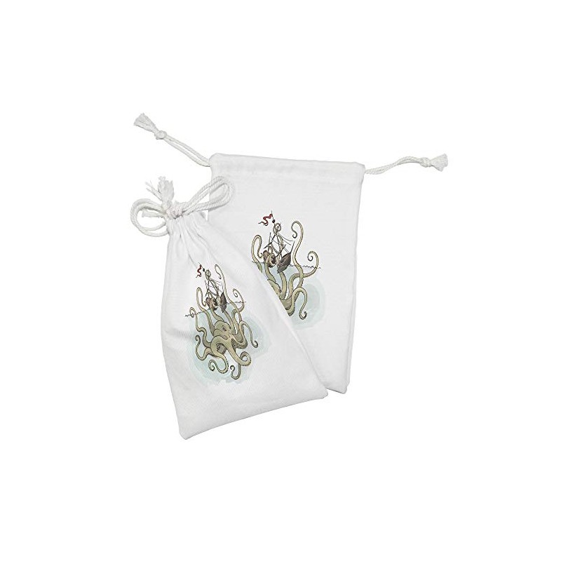Ambesonne Kraken Fabric Pouch Set of 2, Octopus Sinking the Pirate Ships Greek Myth Fish Culture Cartoon Artwork Image, Small Drawstring Bag for Toiletries Masks and Favors, 9" x 6", Tan Pale Green