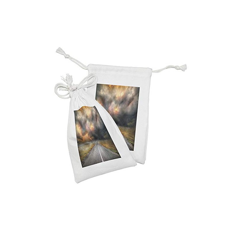 Ambesonne Nature Fabric Pouch Set of 2, Dusty Storm Clouds and Thunder over Highway in Field Electrical Activity Print, Small Drawstring Bag for Toiletries Masks and Favors, 9" x 6", Orange Grey