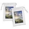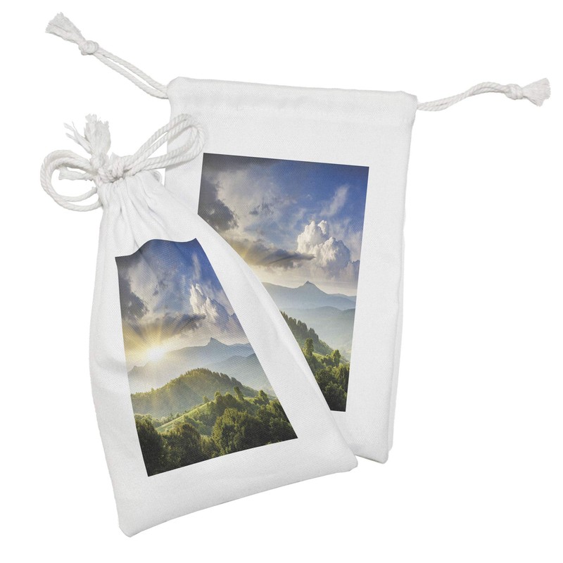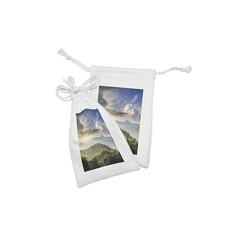Ambesonne Nature Fabric Pouch Set of 2, Rising Sun Clouds over Forest Hill Woodland Idyllic Countryside View, Small Drawstring Bag for Toiletries Masks and Favors, 9" x 6", Olive Green Blue Yellow