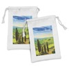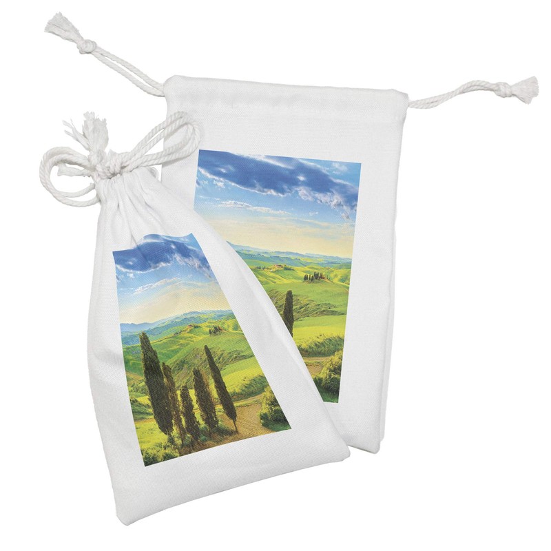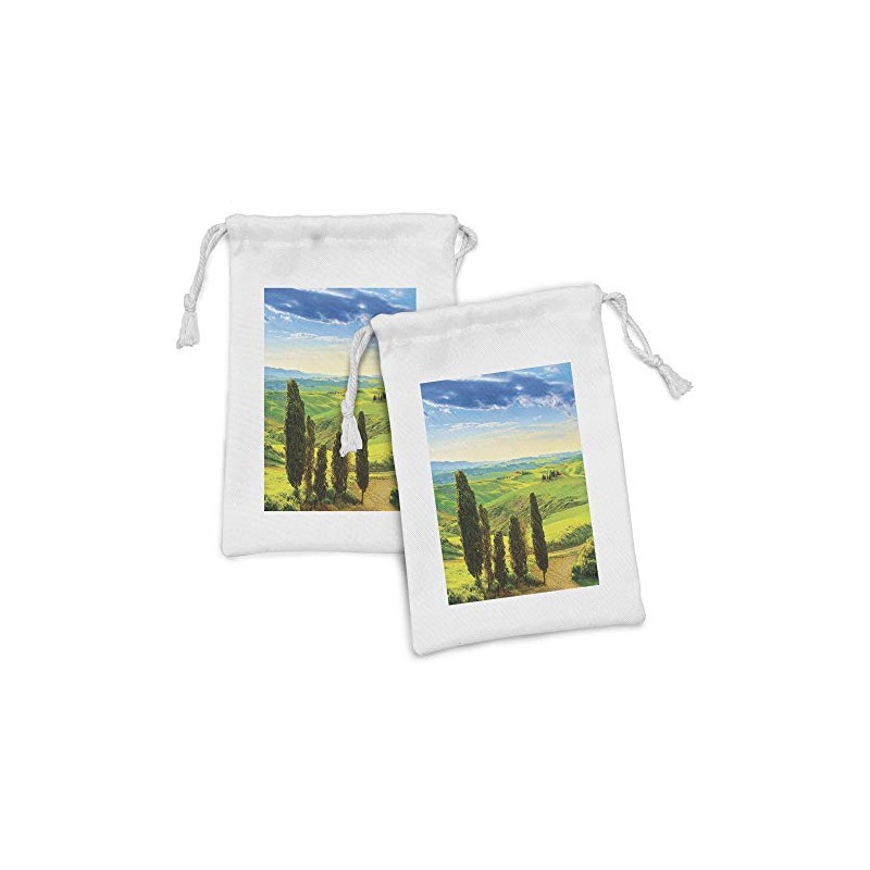 Ambesonne Nature Fabric Pouch Set of 2, Rural Sunset in Italy Countryside with Trees Fresh Meadows and Clear Sky Image Print, Small Drawstring Bag for Toiletries Masks and Favors, 9" x 6", Blue Green