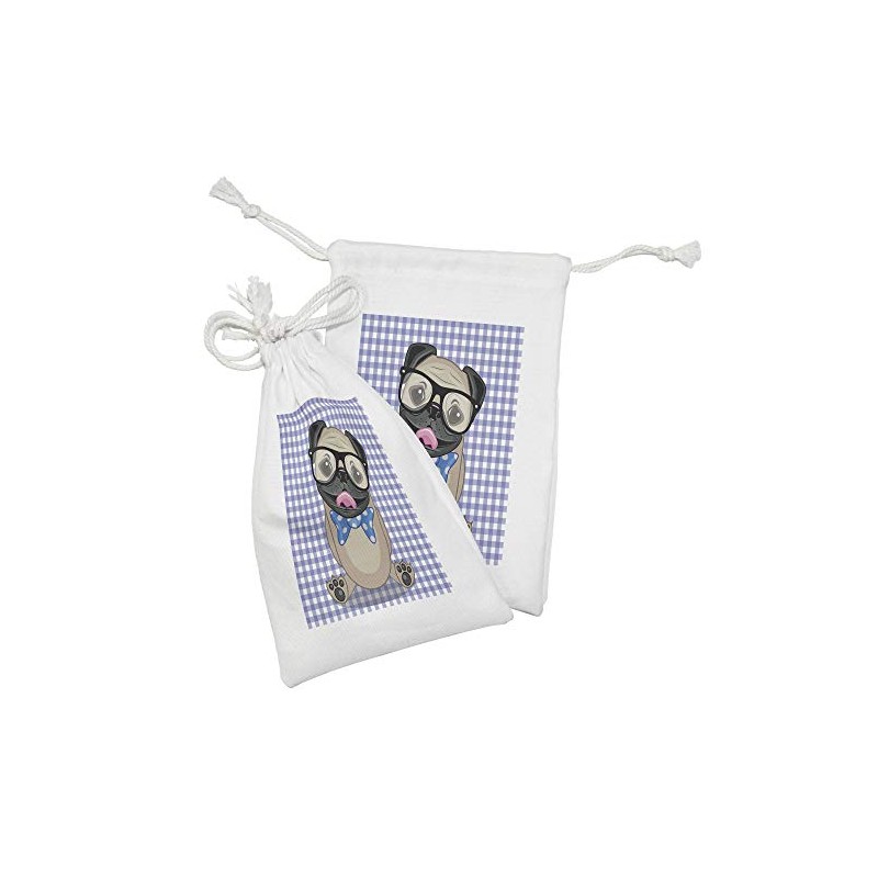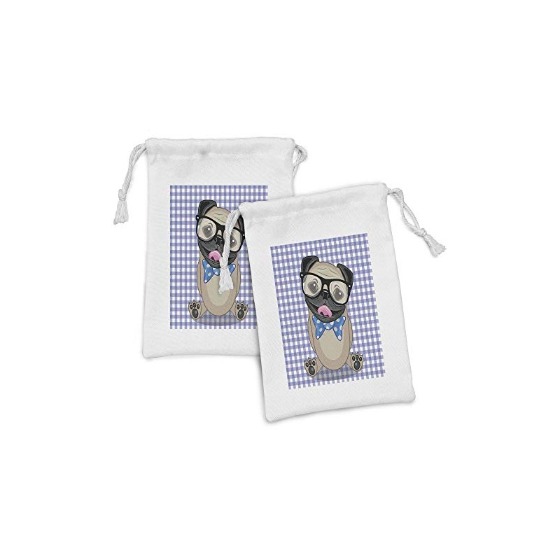 Ambesonne Pug Fabric Pouch Set of 2, Nerdy Glasses and Dotted Bow Tie on a Puppy Pug with a Checkered Backdrop, Small Drawstring Bag for Toiletries Masks and Favors, 9" x 6", Sand Brown Black Blue