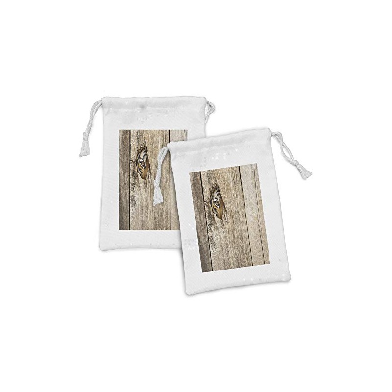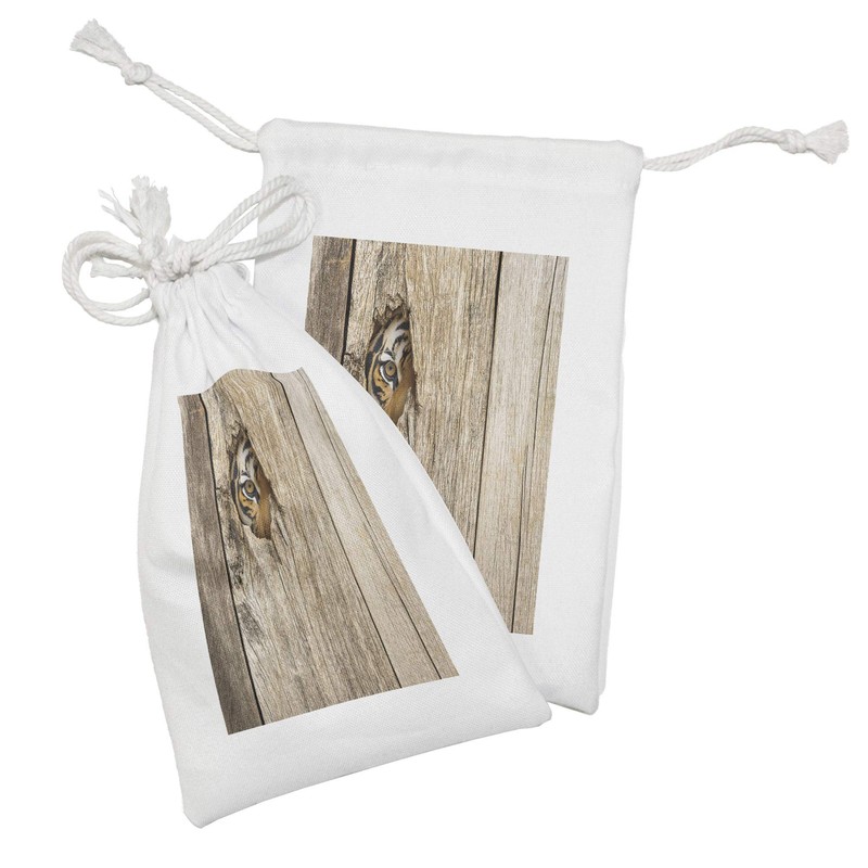 Ambesonne Savannah Fabric Pouch Set of 2, Siberian Tiger Eye Looking Through Wooden Peep Hole in Spy Predator Big Cat Wild Print, Small Drawstring Bag for Toiletries Masks and Favors, 9" x 6", Tan