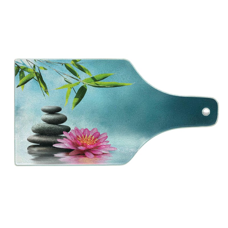Ambesonne Spa Cutting Board, Spa Theme with Lily Lotus Flower and Rocks Yoga Style Purifying Your Soul Theme, Decorative Tempered Glass Cutting and Serving Board, Wine Bottle Shape, Blue Pink Green