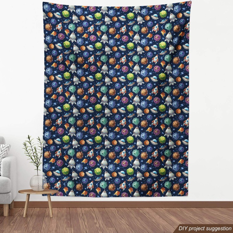Ambesonne Space Fabric by The Yard, Futuristic Science Fiction Comic Planet Spaceships Androids Rockets UFO Illustration, Decorative Fabric for Upholstery and Home Accents, 1 Yard, Navy Teal