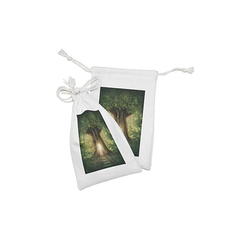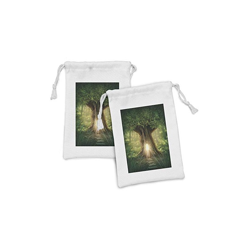 Ambesonne Spring Fabric Pouch Set of 2, Tree of Life Themed Arrangement with Thirving Jungle Season Nature Print, Small Drawstring Bag for Toiletries Masks and Favors, 9" x 6", Green Pale Yellow