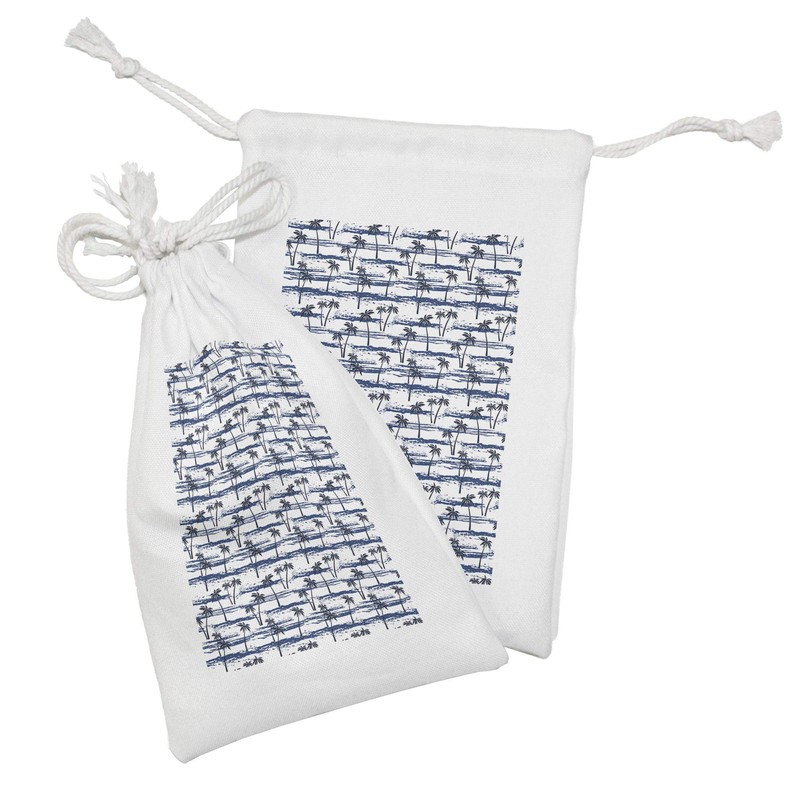 Ambesonne Tropical Fabric Pouch Set of 2, Silhouette Tropical Beach Image with Sand and Coconut Palm Trees, Small Drawstring Bag for Toiletries Masks and Favors, 9" x 6", Night Blue Dark Blue