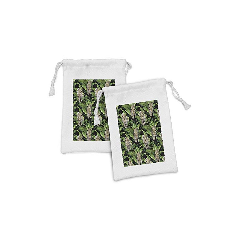 Ambesonne Wildlife Fabric Pouch Set of 2, Wild and Dangerous Leopards and Palm Leaves Island Setting, Small Drawstring Bag for Toiletries Masks and Favors, 9" x 6", Charcoal Grey Brown