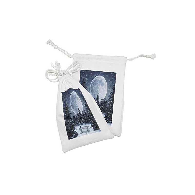 Ambesonne Winter Fabric Pouch Set of 2, Dreamy Cold Night a Big Full Moon and Bench Park Stars in the Darkness, Small Drawstring Bag for Toiletries Masks and Favors, 9" x 6", Blue White