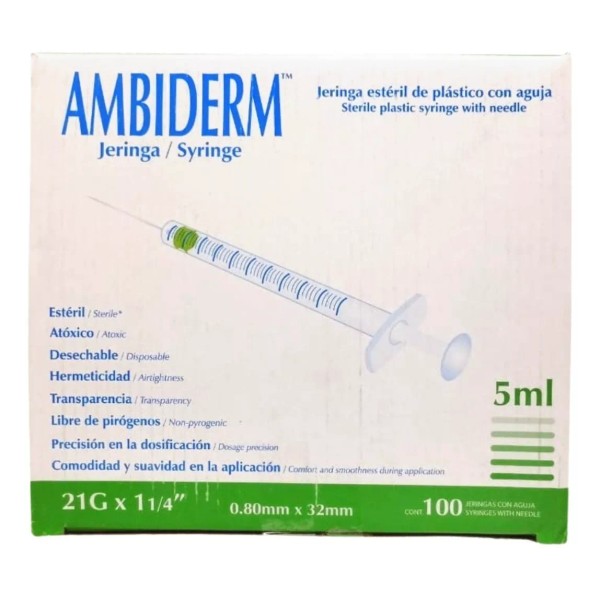 Ambiderm 100 Jeringas De Plástico 5ml Con Aguja 21gx32mm Estéril