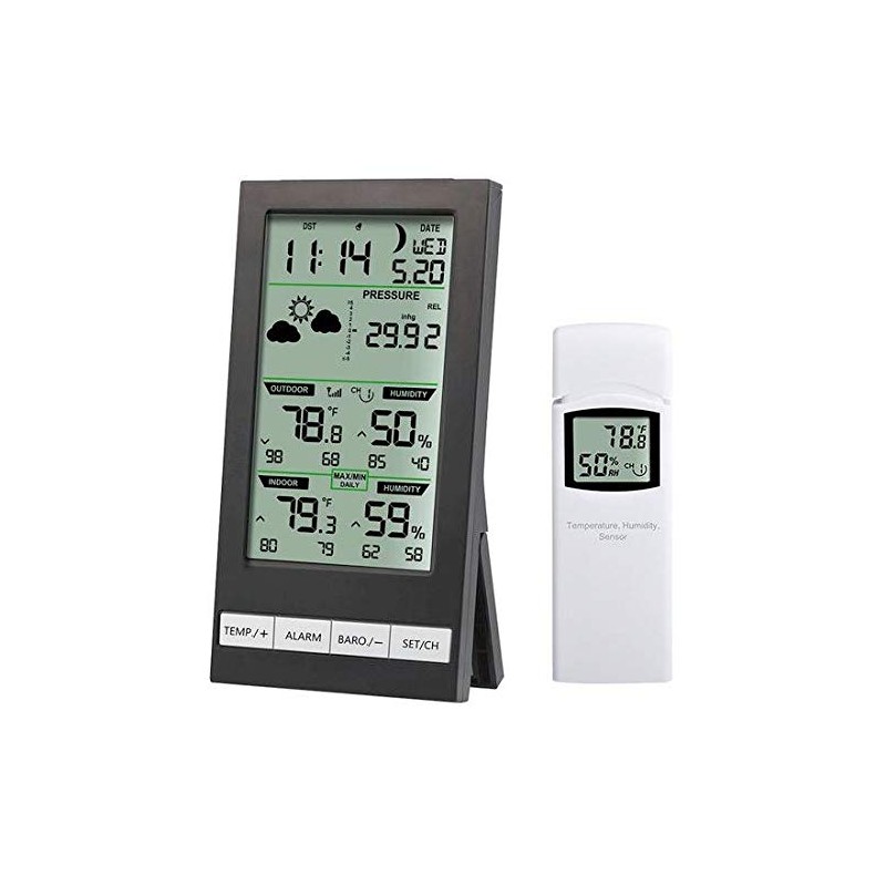 The Ambient Weather WS-2700 Advanced Weather Center displays a wide range of information in an easy-to-read format on a large LCD. The attractively thin console can be placed on a desktop or mounted to a wall and features a forecast icon that reacts to changes in barometric pressure, providing a forecast for upcoming weather in the next 24 to 48 hours with reasonable accuracy. The main display receives temperature and humidity data from the included wireless remote sensor and supports up to three wireless sensors. The remote wireless sensor transmits up to 300 feet line of sight (100 feet under most conditions) includes an LCD display, so the temperature and humidity can be read in both locations. The unit monitors indoor and outdoor temperature and humidity, outdoor dew point, as well as barometric pressure (both sea-level and measured), and features a rate of change indicator. The handy forecast icons let you know at a glance if it’s going to be rainy, cloudy, or sunny based on barometric pressure trends. Other features include min and max that resets daily or manually, barometric pressure trend arrow, and moon phase. Time and date set automatically, sync with the U.S. atomic clock (WWVB & Dcf), and automatically updates for daylight saving time (on / off option) for utmost accuracy. The clock also features 12 or 24-hour time display, perpetual calendar, alarm with snooze, and temporary back light for nighttime viewing. **Specifications:**