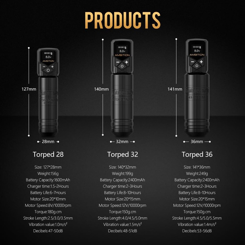 - Size: Ambition short tattoo pen made of aluminium alloy frame and CNC carved. Total Length:140mm/5.51inches,diameter:36mm/1.42inches, total weight:249g/8.78oz. Short and portable, it has minimal vibration and stable weight,give the tattooist better control and less fatigue. Ambition Tattoo Power Supply made of aluminium alloy frame and high quality acrylic, the size is small, easy to carry so that you can do tattoo work outdoors.