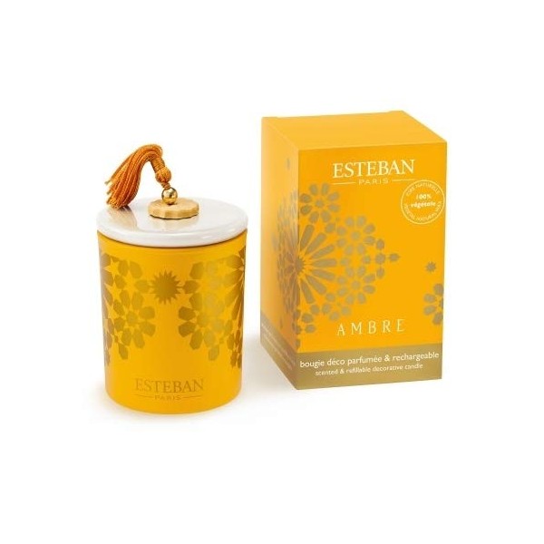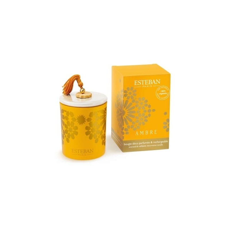 To warm the hearts and provide the rare and precious scent of amber, Esteban has developed a "solar" candle. The Ambre scented candle features a bright yellow with golden accents and brightens up a harmony in the Orient: an enchanting heseridated amber Hesperidia chord with woody notes that envelops the atmosphere of warmth and happiness.