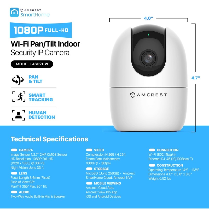 Amcrest Amcrest 1080P WiFi Camera Indoor, Nanny Cam, Dog Camera, Sound & Baby Monitor, Human & Pet Detection, Motion-Tracking, Phone App, Pan/Tilt Wireless IP Camera, Night Vision, Smart Home ASH21-W