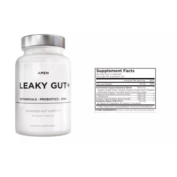 - Digestive supplement: Amen Leaky Gut + is an all-in-one digestive supplement that provides bioavailable amino acid L glutamine, zinc, organic turmeric, licorice root, and marshmallow root along with a blend of probiotics in easy to use capsule format.