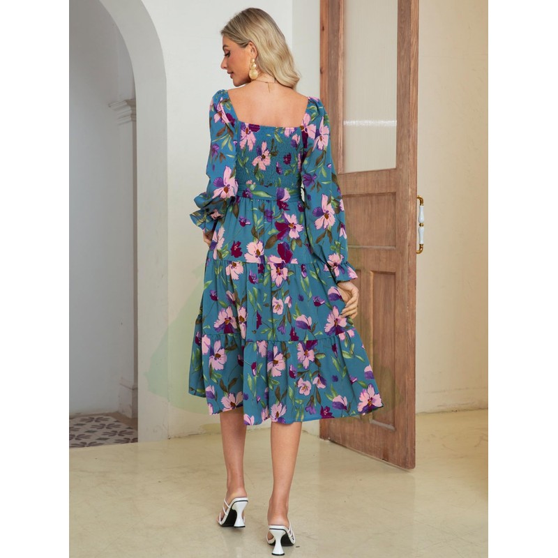 Amegoya Women's Floral Long Sleeve Midi Dress Boho Wedding Guest Dress Square Neck Smocked Tiered Flowy Dress (Floral Blue L)