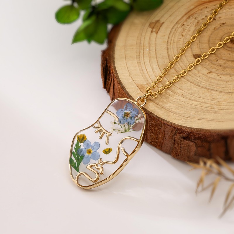 - Size: The pendant is a handmade item measuring 1.3inches in height and 0.82inches in width. It's made of materials such as14K Gold Plated over brass, Forget-me-nots flowers, Queen Annes lace, resin, and gold flakes. The chain is a perfect fit for everyday wear, measuring 18 inches(fixed chain length) and made of Stainless Gold Plated materials.