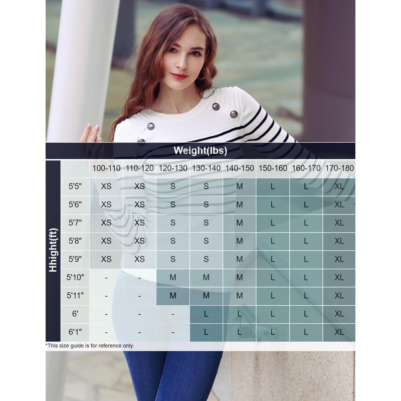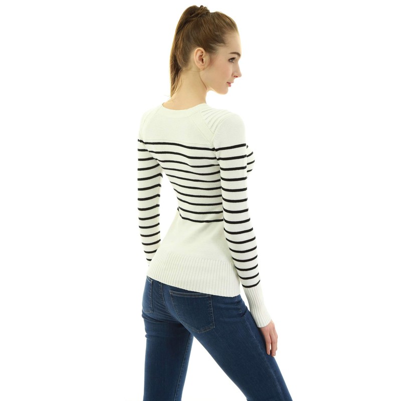 AmelieBoutik Crewneck Striped Long Sleeve Military Button Embellished Pullover Jumper Sweater Knit Top. Model in pictures is 5 feet 10 inches (178cm) tall wearing size S.